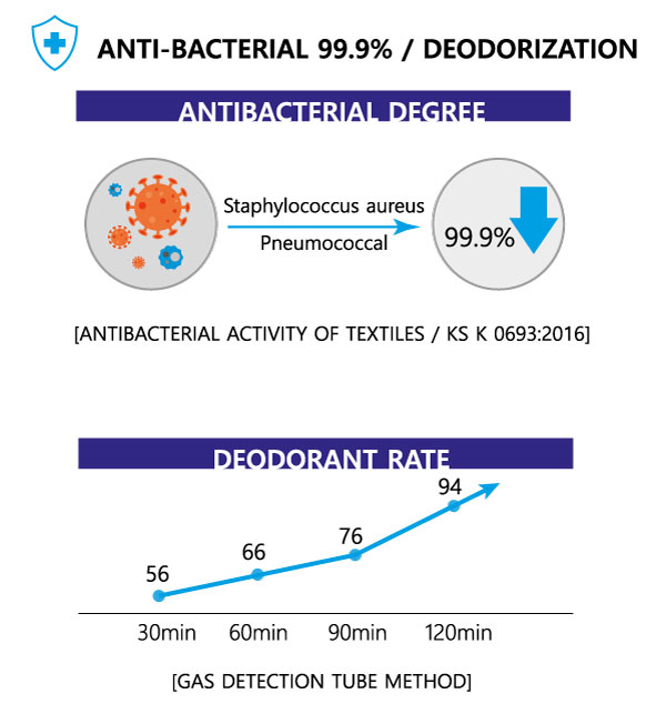 K'on+m could be anti-bacterial at the level of 99.9% and prevent bacteria from reproducing, The antibacterial function lasts 99.9% even after washing more than 30 times. and after 2 hours, 99% of the smell disapperars.