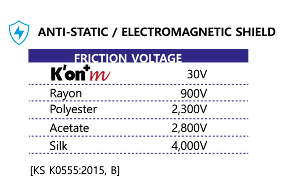 With electro-conductive Copper ion, K'on+m is highly antistatic and anti-electromagnetic and also protect human body against elecyromagnetic waves emitted from household appliances.